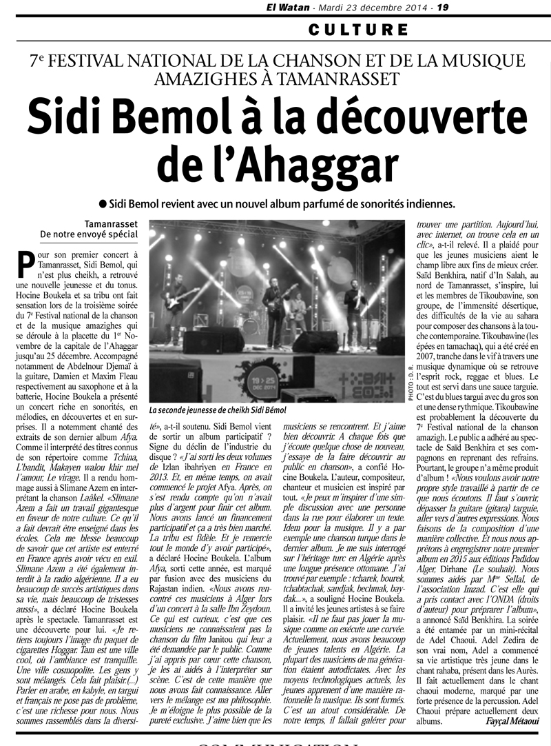 Tamanrasset est une découverte pour lui. «Je retiens toujours l’image du paquet de cigarettes Hoggar. Tam est une ville cool, où l’ambiance est tranquille. Une ville cosmopolite. Les gens y sont mélangés. Cela fait plaisir.(…) Parler en arabe, en kabyle, en targui et français ne pose pas de problème, c’est une richesse pour nous. Nous sommes rassemblés dans la diversité», a-t-il soutenu. Sidi Bemol vient de sortir un album participatif ? Signe du déclin de l’industrie du disque ? «J’ai sorti les deux volumes de Izlan ibahriyen en France en 2013. Et, en même temps, on avait commencé le projet Afya.